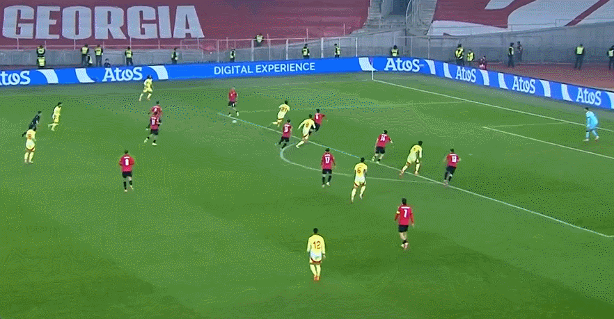 此役开局第7分钟,托雷斯突入三秒区迎球传禁区造成戈霍利什维利手球,西班牙因此获得十二码机会,奥瓦萨瓦尔随即主罚十二码破门首开记录。第34分钟,托雷斯前插到门前接应奥亚萨瓦尔横传推远角准空门命中,力助西班牙将领跑位优势扩展到3-0。