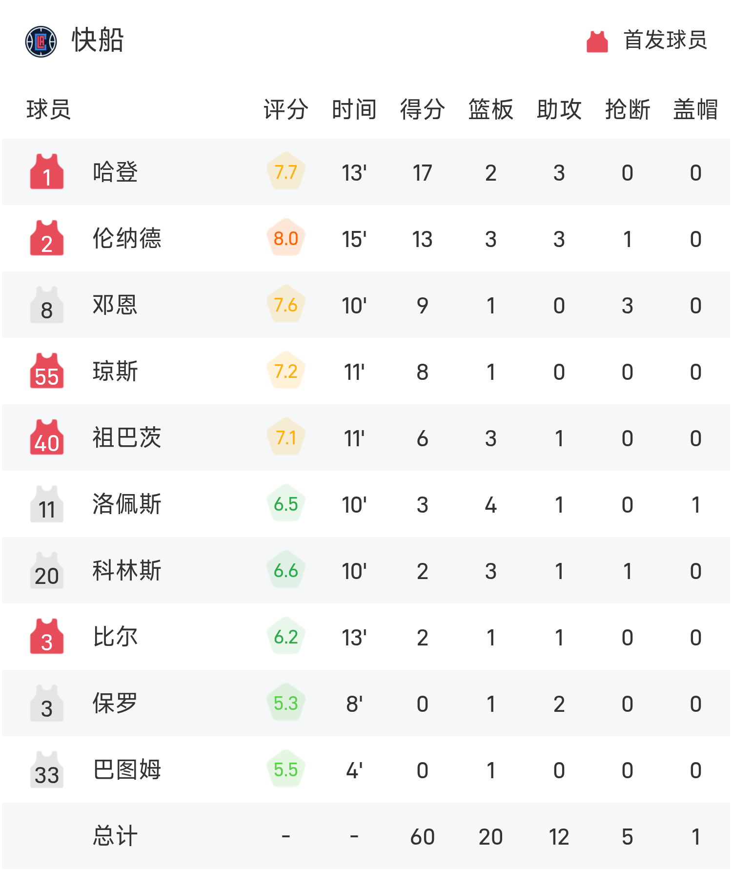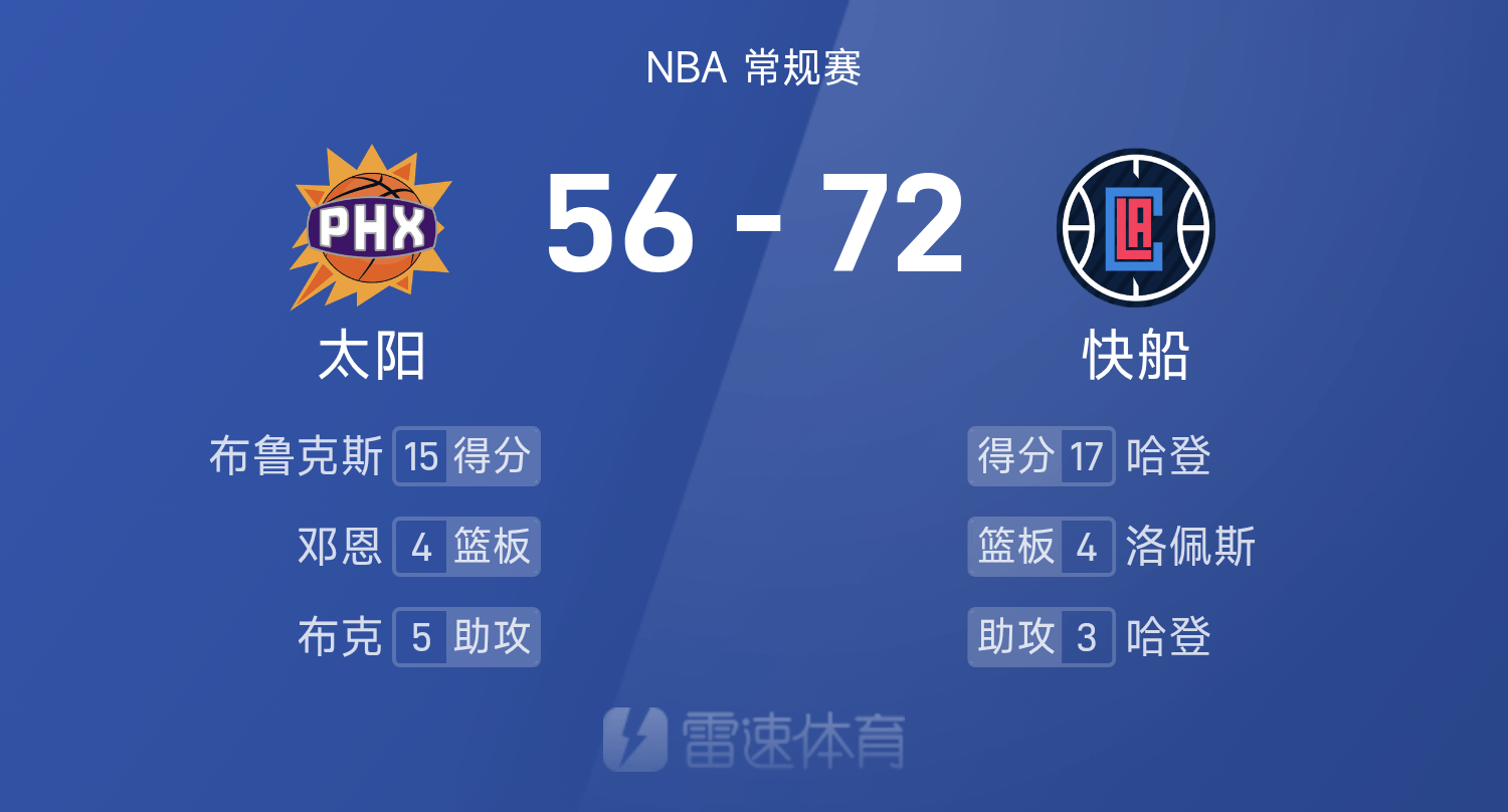 哈登三分球6投5中高效轰下26分3板4助攻,布克仅得8分,快船半场72-56太阳