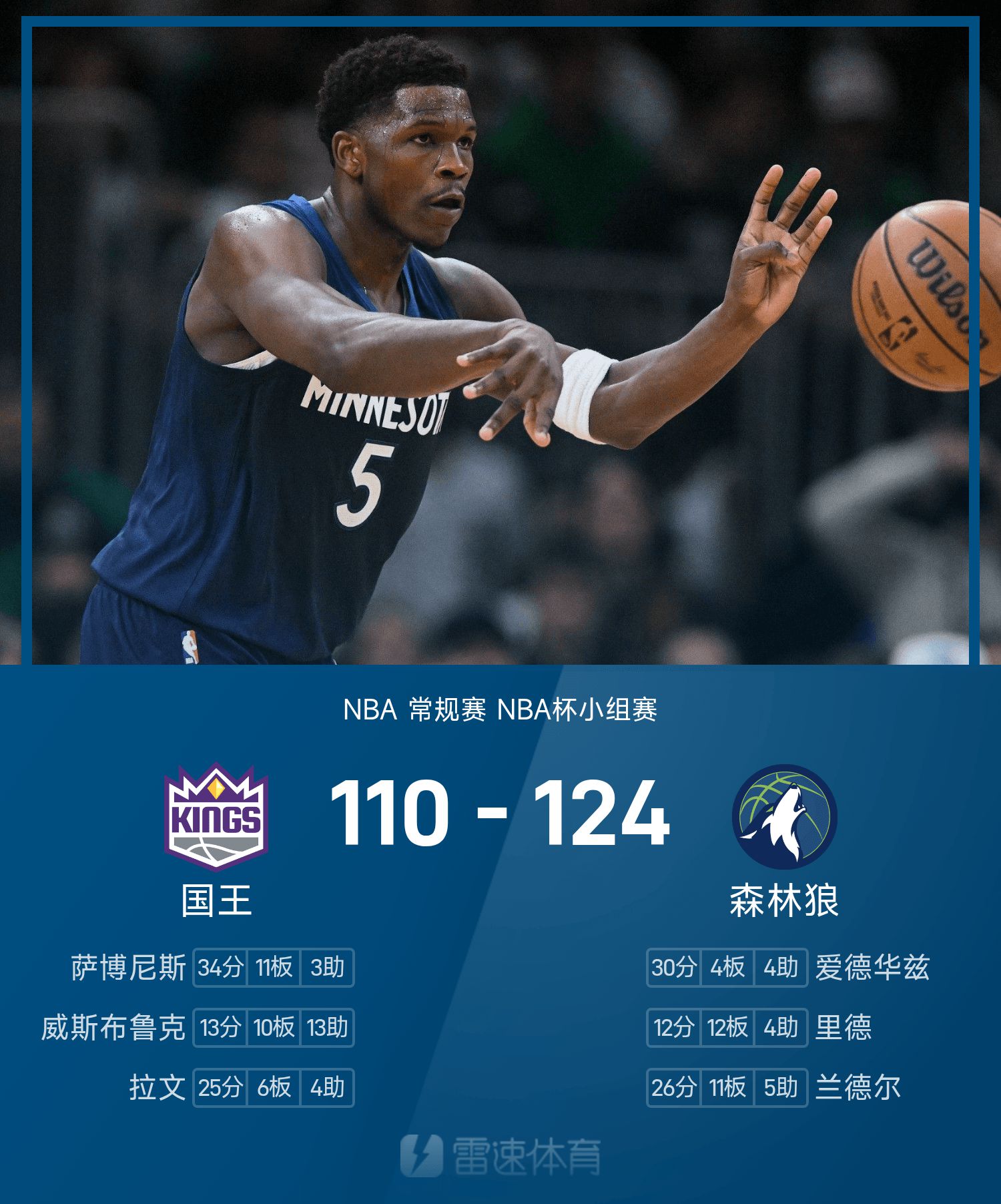 爱德华兹30分4板4助率队四连胜,萨博尼斯空砍34分11抢篮板3助攻。