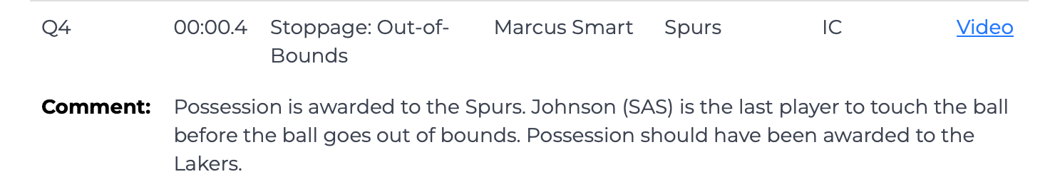 最后0.4秒,球出界前,凯尔登·约翰逊是最后触球的人,但裁判员吹的是斯玛特碰出界,球权给了马刺,此处为差错裁决,球权应该判给湖人。