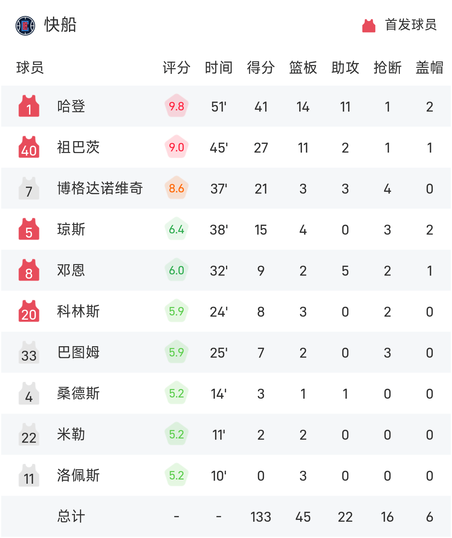 6686体育平台11月15日讯 25/26赛季NBA 常规赛 NBA杯分组赛,独行侠对阵快船。双方全场战罢,独行侠127-133不敌快船。哈登砍下全场最高的41分14板11助,率领快船胜利取胜。