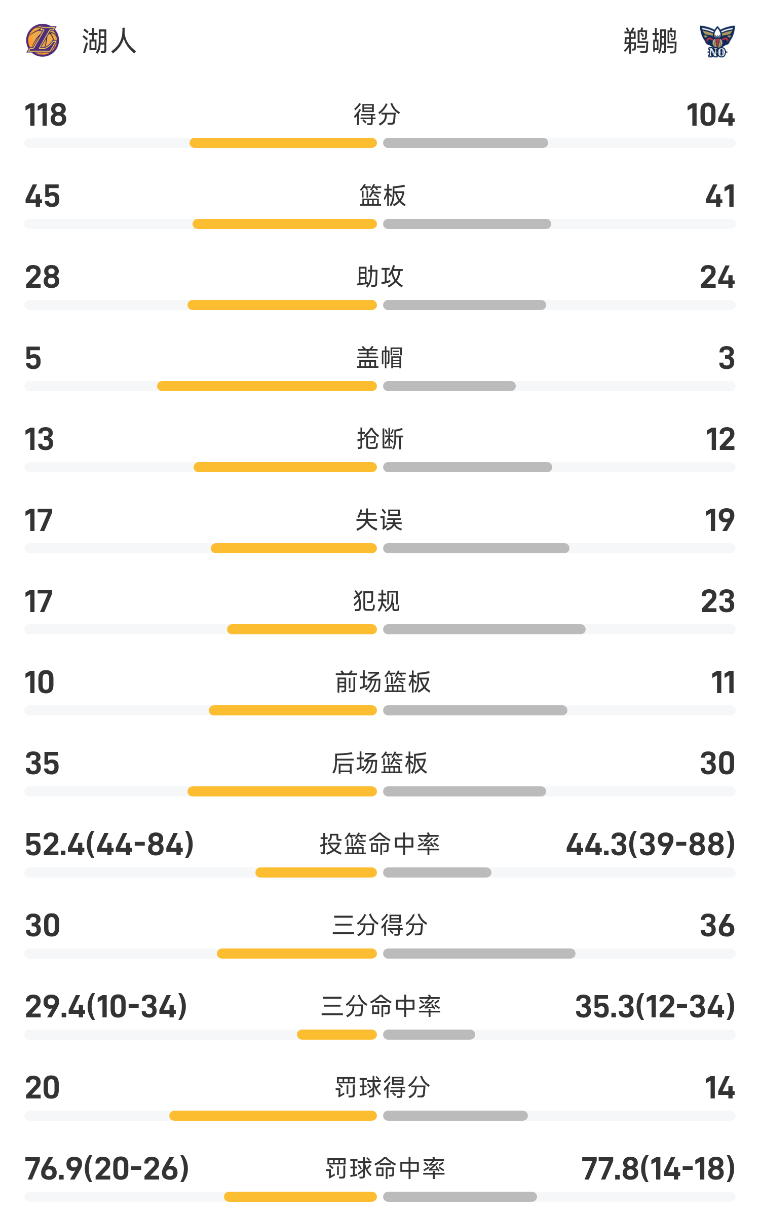 双方全场战罢,鹈鹕104-118不敌湖人。