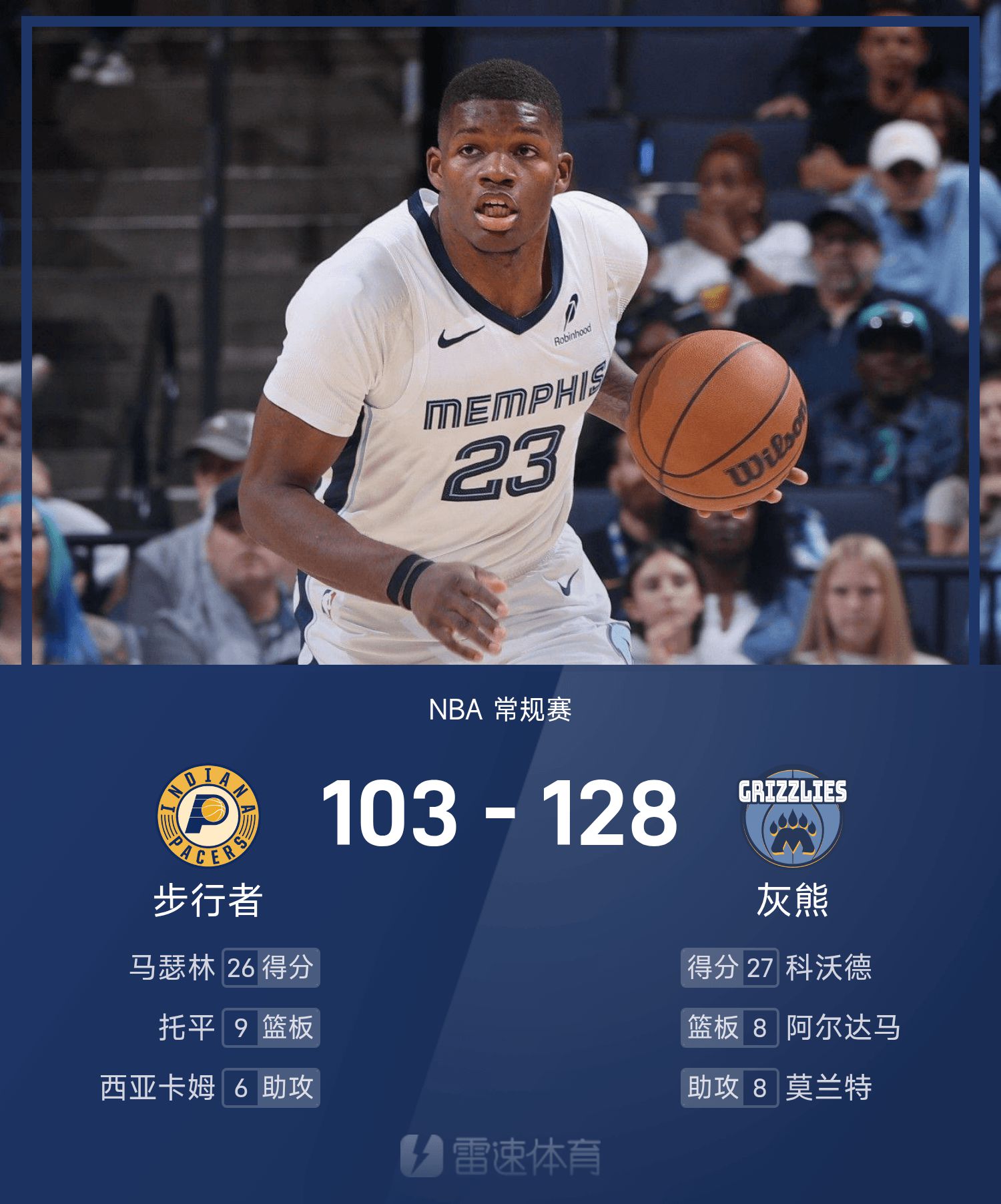 双方全场战罢,灰熊128-103战胜步行者。