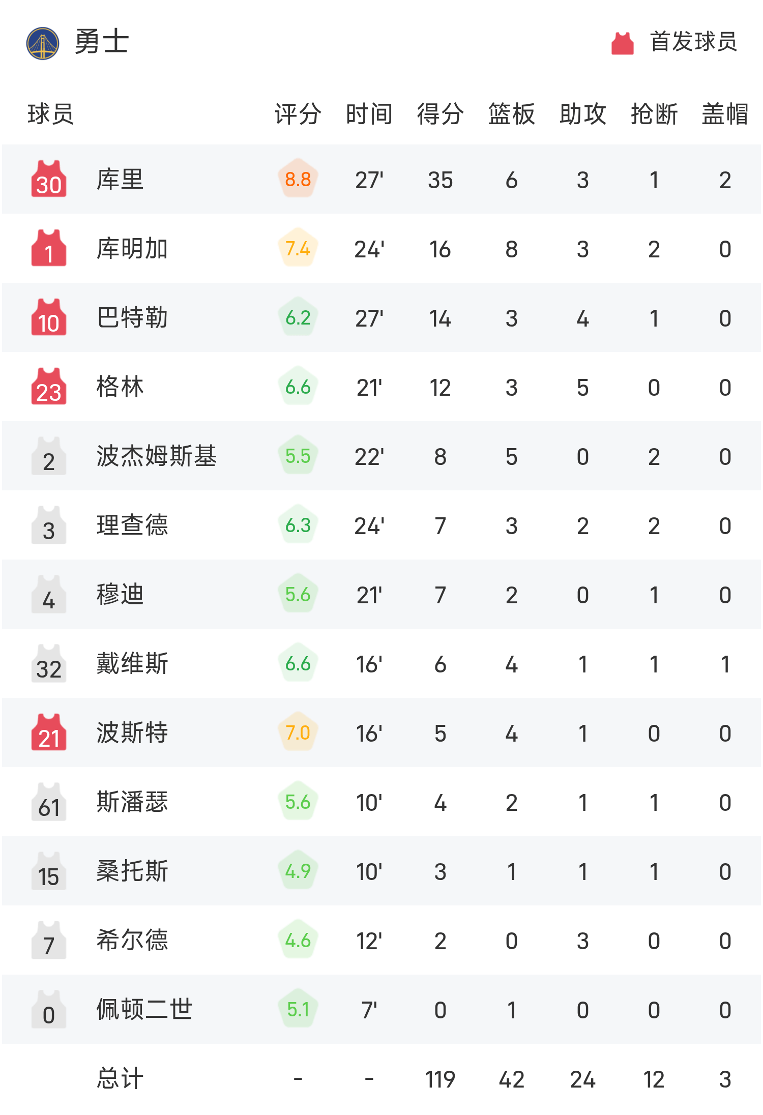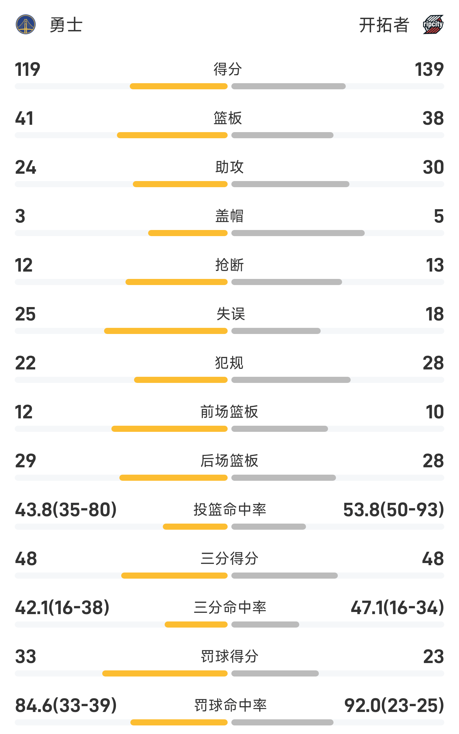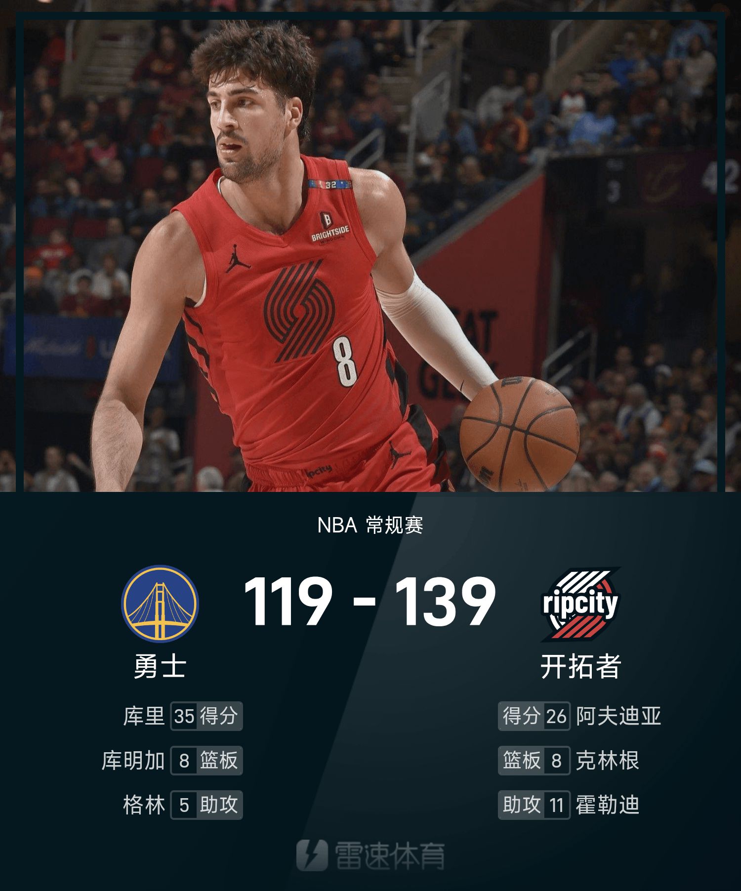 6686体育平台10月25日讯 25/26赛季NBA 常规赛,开拓者对阵勇士。双方全场战罢,开拓者139-119战胜勇士。阿夫迪亚得到26分5板6助率队取胜,库里空砍全场最高的35分6板3助。