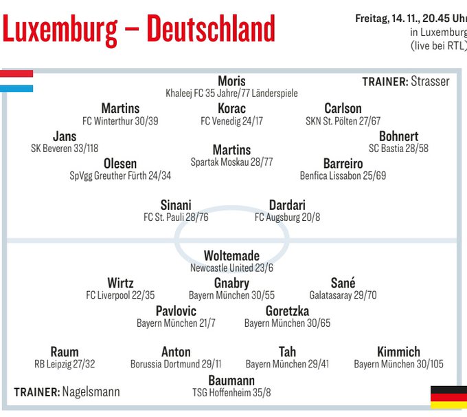 6686体育平台11月13日讯 世杯赛资格赛欧洲区分组赛,德国队将客队场挑战卢森堡队。赛前,德国体育媒体《踢球者》预测了本场竞赛德国队的首发阵容。其中,效力于纽卡斯尔的五号位沃尔特马德出现在单箭头位置,在利物浦表现挣扎的维尔茨获得首发机会,出现在左边路前锋位置,重返国家队的萨内出现在右边路前锋位置。