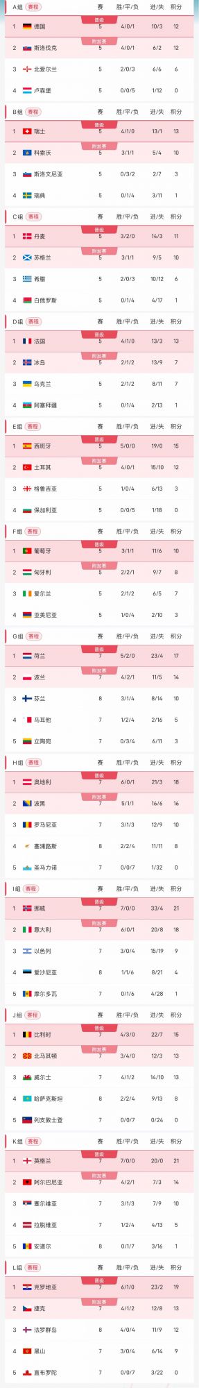 瑞士本轮4-1大胜瑞典,目前积13分排名榜首,科索沃2-0击败斯洛文尼亚,积10分排名第二。瑞士与科索沃末轮直接对话,但是瑞士净胜球暂为12粒,领跑位科索沃11球,因此瑞士末轮不大赛果分输球即晋级世杯赛。值得一提的是,瑞典目前5轮不胜,但球队凭借欧国联最好的4个小组头名之一,已确定参加世欧预附加赛。