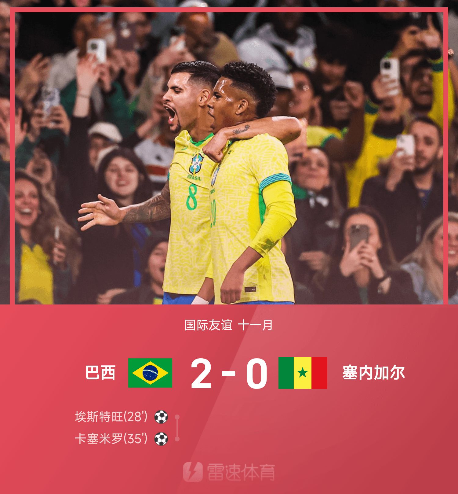 国际友谊战报:埃斯特旺、卡塞米罗破门,巴西2-0塞内加尔