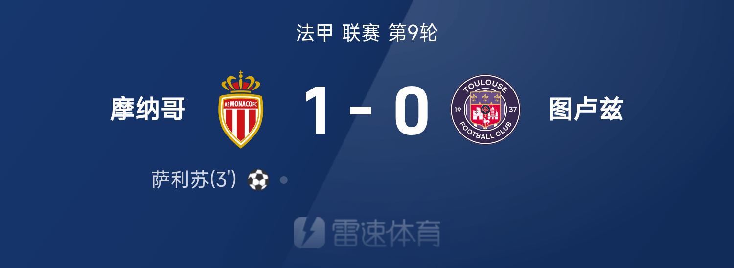 法甲战报:萨利苏破门制胜,摩纳哥1-0战胜图卢兹