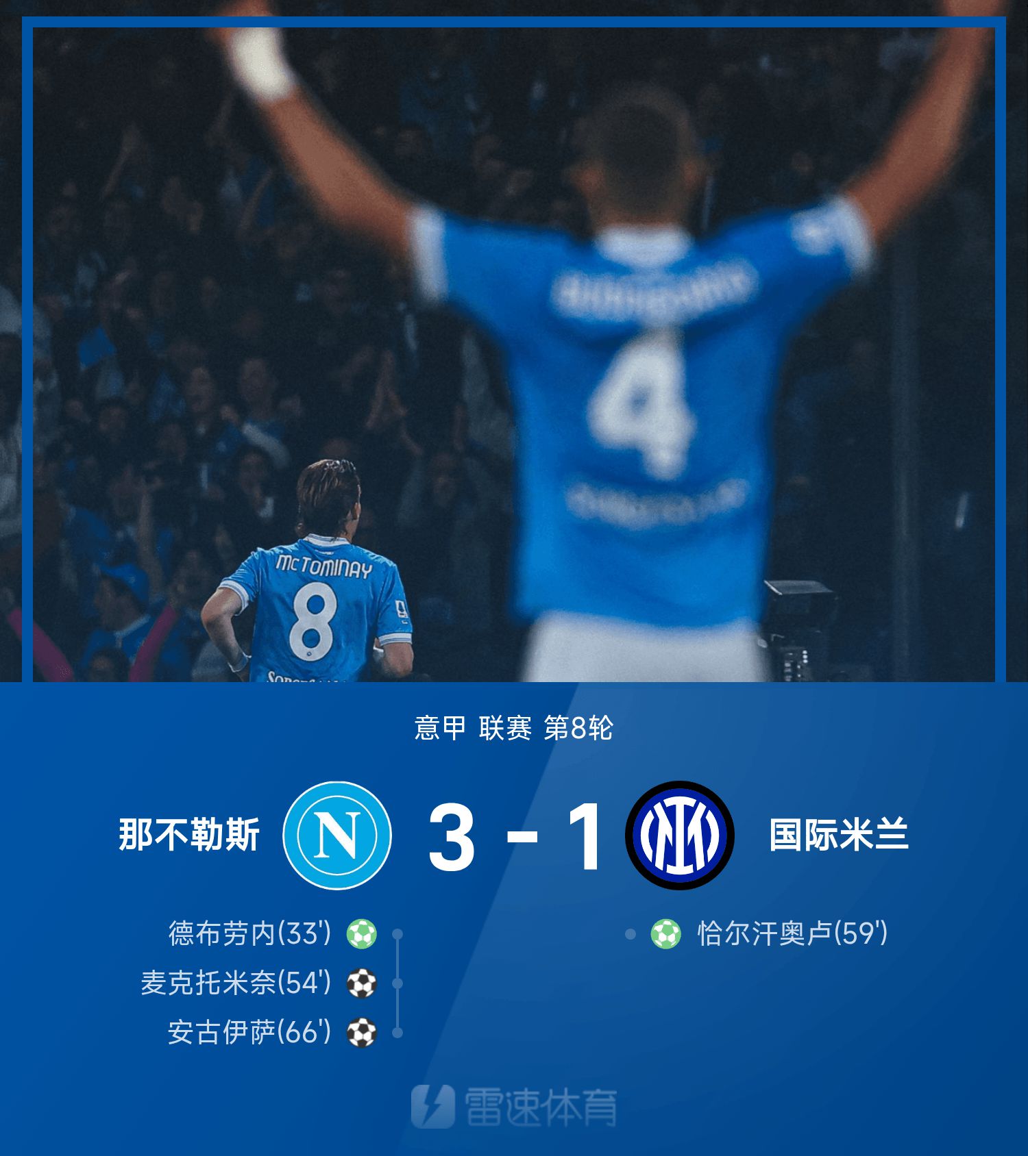 意甲战报:德布劳内、恰尔汗奥卢均点射,那不勒斯3-1国米