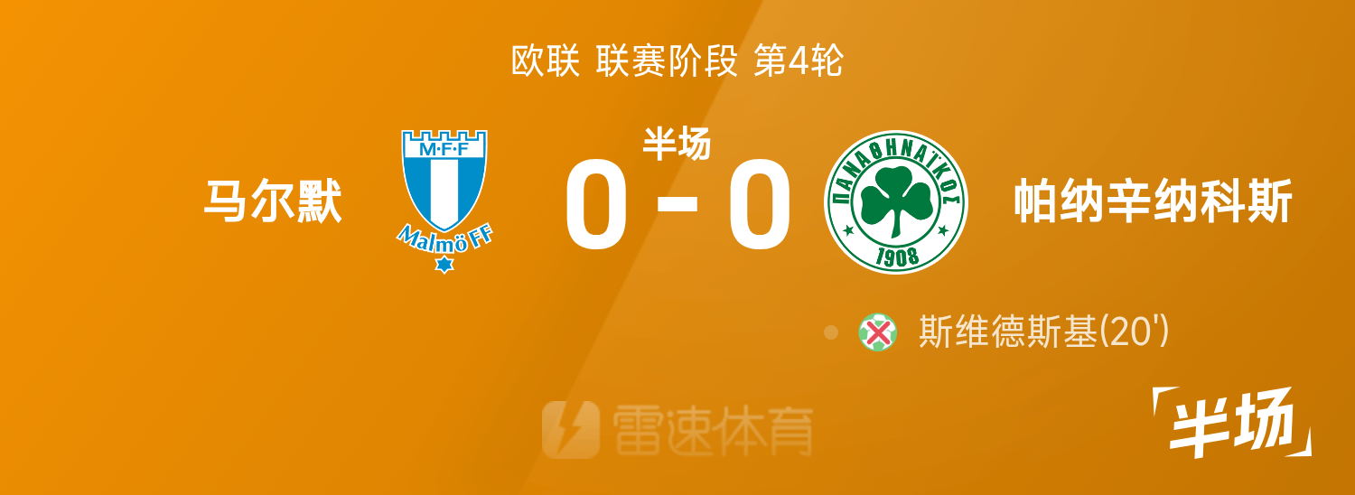 欧联半场:斯维德斯基失点,马尔默0-0帕纳辛纳科斯